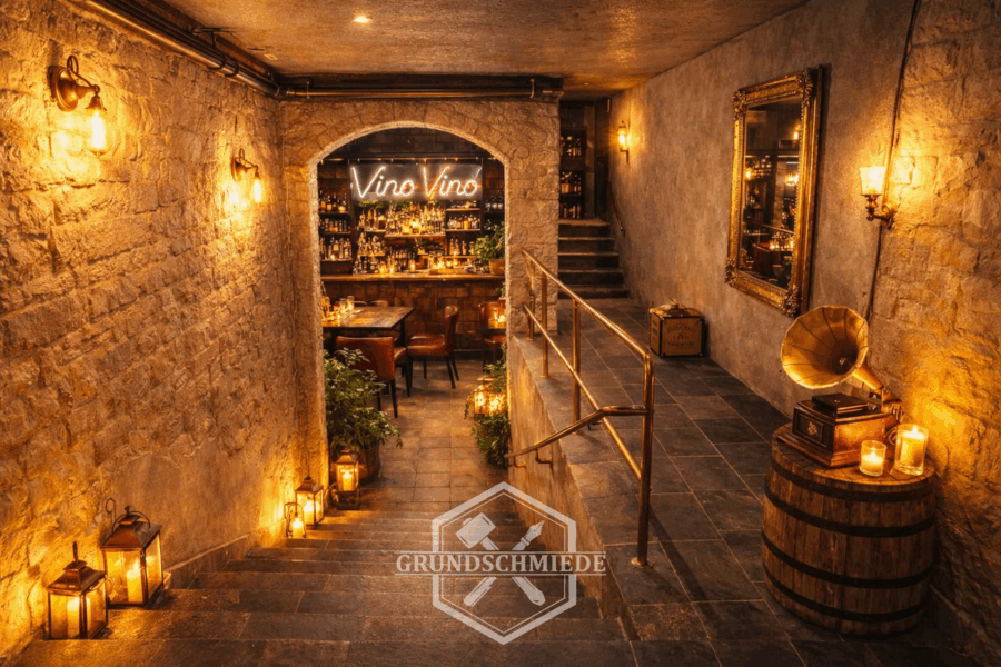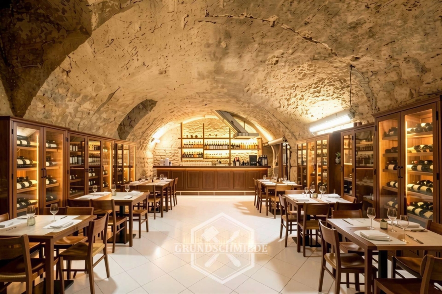 Die Nutzung als Bar ist bereits genehmigt, wodurch sich vielfältige Möglichkeiten ergeben – beispielsweise für ein stilvolles Konzept im italienischen Design oder eine charaktervolle Wein- oder Cocktailbar. Anschlüsse für Gas und Wasser sind vorhanden, sodass auch die Einrichtung von Gäste-WCs innerhalb des Gewölbekellers realisierbar ist.