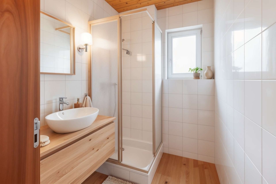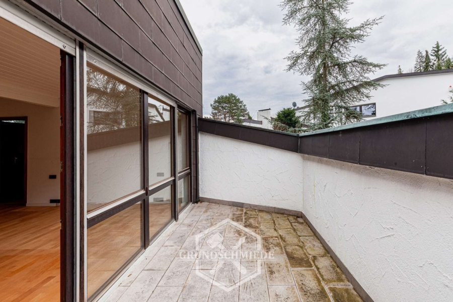 Im Obergeschoss empfängt Sie eine offene Galerie, die den Blick in den Wohnbereich freigibt. Hier befindet sich ein Schlafzimmer mit bodentiefen Fenstern und direktem Zugang zu einem Balkon, der ausreichend Platz für Tisch und Stühle bietet. Ein angrenzender Abstellraum sorgt für zusätzlichen Stauraum. Ergänzt wird diese Etage durch ein Tageslichtbad mit Dusche und WC.