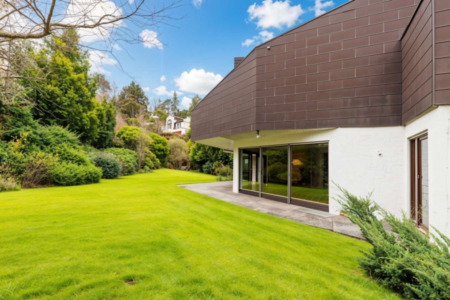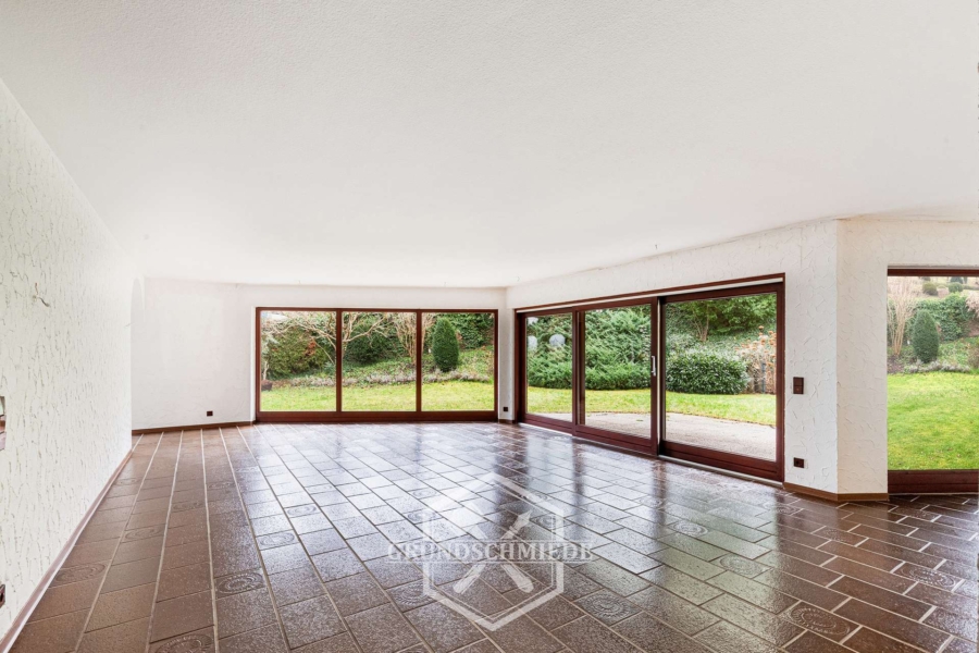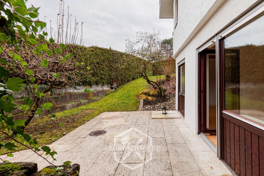 Das Herzstück des Hauses bildet der helle Wohnbereich im Erdgeschoss. Bodentiefe Fenster sorgen hier für eine beeindruckende Lichtatmosphäre und eröffnen einen direkten Blick in den wunderschön angelegten, weitläufigen Garten. Über großflächige Schiebetüren gelangt man unmittelbar auf die Terrasse und in den Garten, der sich großzügig in den Hang hinein erstreckt und vielfältige Nutzungsmöglichkeiten bietet. Der Garten ist ein echtes Highlight dieser Immobilie und vermittelt ein Gefühl von Ruhe, Privatsphäre und Naturverbundenheit.