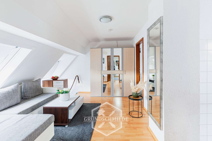 Der helle und einladende Wohnbereich bildet das Herzstück der Wohnung. Durch die Dachschrägen entsteht eine warme und behagliche Atmosphäre, während die gut platzierbaren Stellflächen genügend Raum für individuelle Einrichtungsideen bieten. Große Fenster sorgen für angenehmes Tageslicht und einen freundlichen Gesamteindruck.