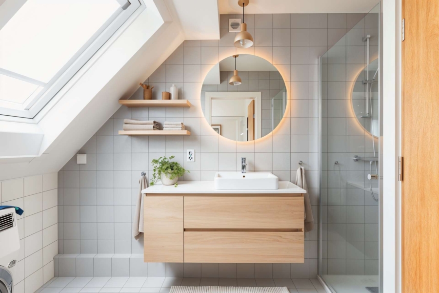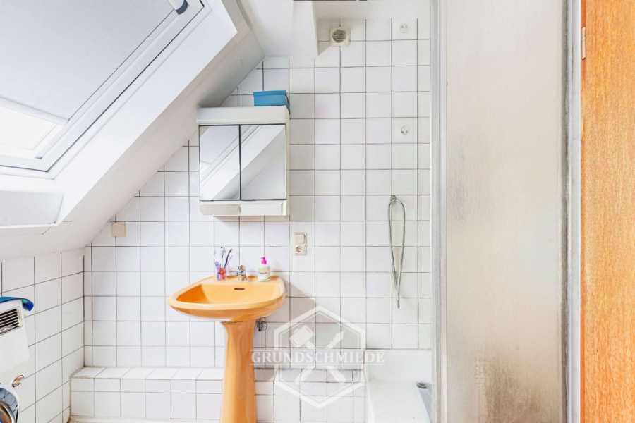 Das modernisierte Tageslichtbad ist mit einer Dusche, einem WC sowie einem Waschmaschinenanschluss ausgestattet. Die natürliche Belichtung schafft eine angenehme Atmosphäre, und die sinnvolle Raumaufteilung sorgt für hohen Komfort auf kompakter Fläche.