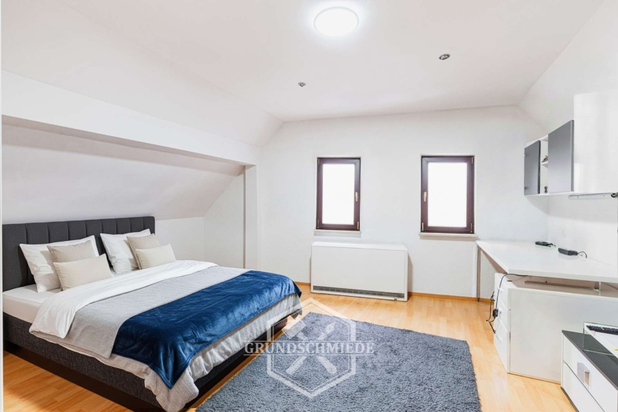 Das ruhig gelegene Schlafzimmer bietet Platz für ein Doppelbett sowie ergänzendes Mobiliar. Auch hier tragen Dachschrägen und Fenster zu einem gemütlichen Wohngefühl bei. Der Raum eignet sich ideal als Rückzugsort und verspricht erholsame Nächte.