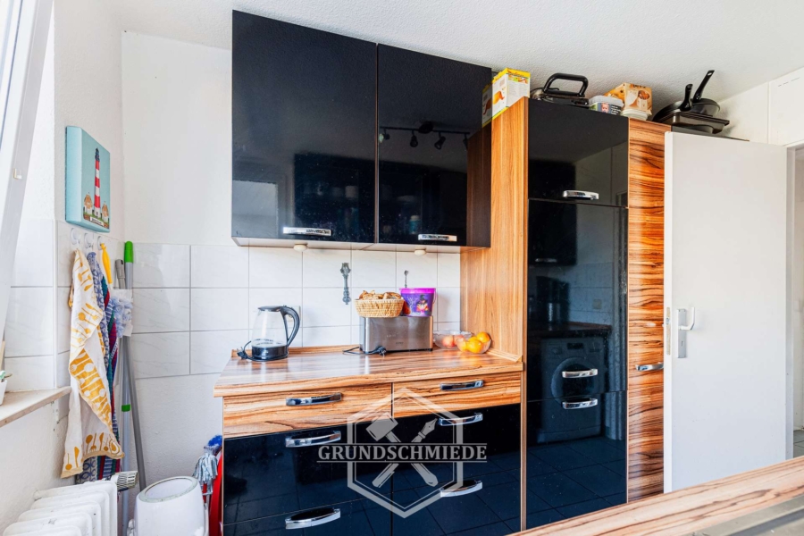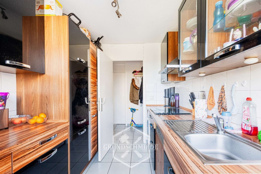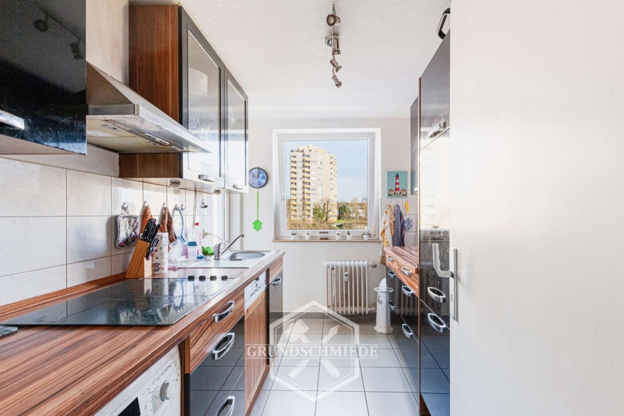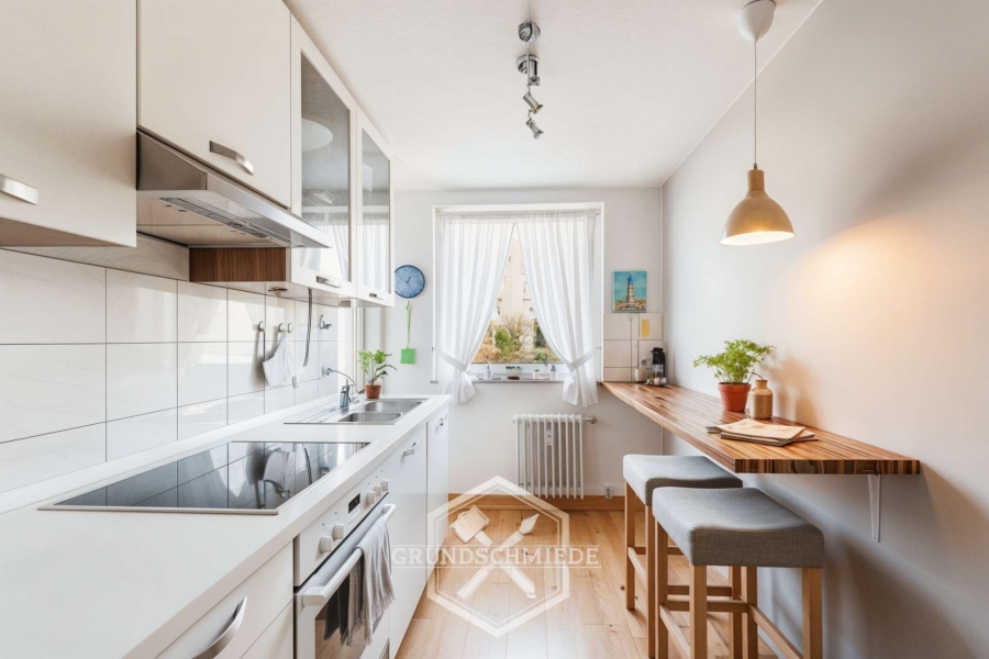 Die Küche ist separat gehalten und bietet genügend Raum für eine funktionale Arbeitsgestaltung. Die vorhandene Einbauküche ist Eigentum des Mieters. Von der Küche aus gelangen Sie auf einen kleinen, gemütlichen Balkon, der sich ideal für eine kleine Sitzgelegenheit oder Kräuterkästen eignet.