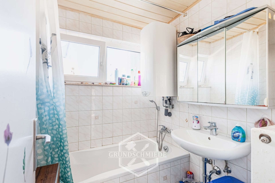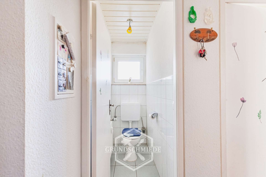 Ein besonderes Plus ist das separate WC, das den Wohnkomfort zusätzlich steigert. Das Tageslichtbad präsentiert sich in hellem Weiß und ist mit einer Badewanne ausgestattet.