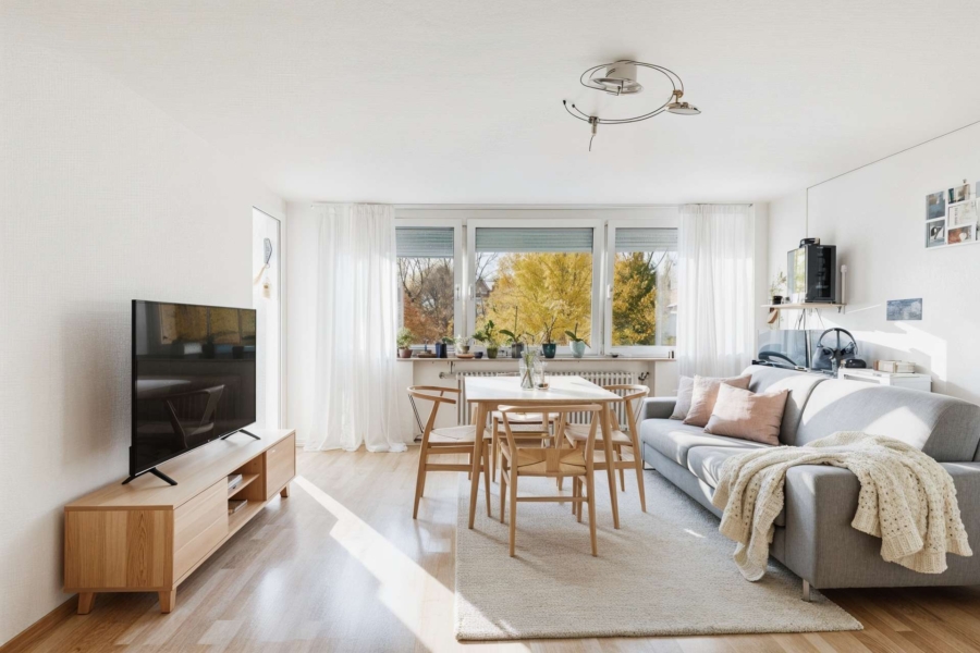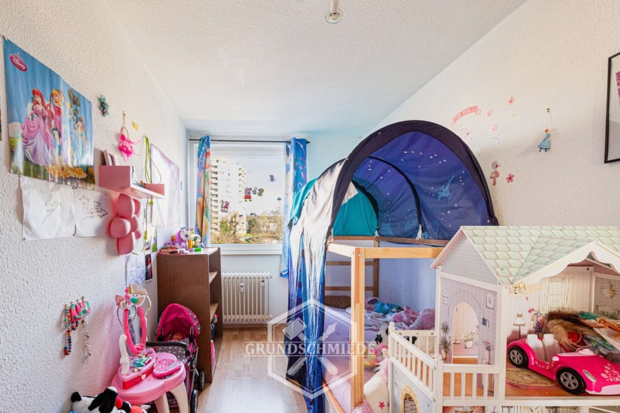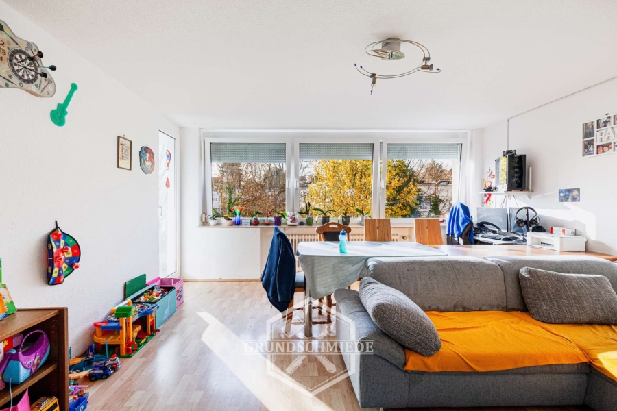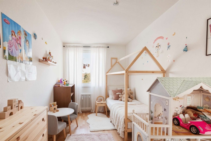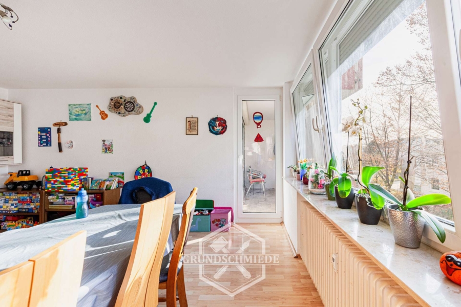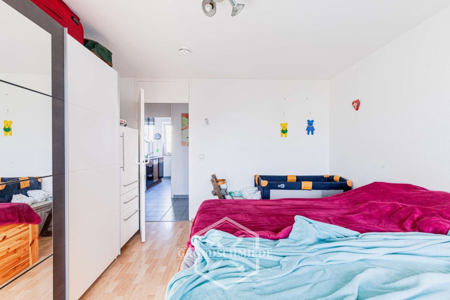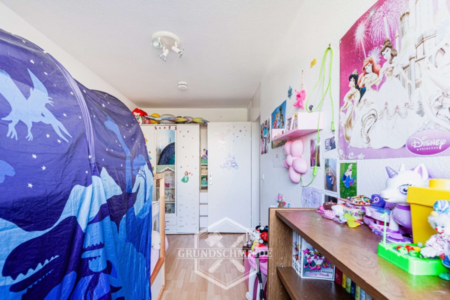 Das Wohnzimmer ist großzügig geschnitten und bietet ausreichend Platz für eine Wohnlandschaft sowie einen Essbereich. Durch die großen Fensterflächen wirkt der Raum sehr hell und freundlich. Von hier besteht Zugang zum großen Süd-Balkon. Das Schlafzimmer überzeugt durch seine großzügigen Fensterfronten, die für ein besonders angenehmes, lichtdurchflutetes Ambiente sorgen. Auch von diesem Raum aus gelangen Sie auf den großen Balkon. Das Kinderzimmer bietet viel Platz, ist ebenfalls hell gestaltet und ermöglicht eine flexible Nutzung – ob als Kinder-, Arbeits- oder Gästezimmer.