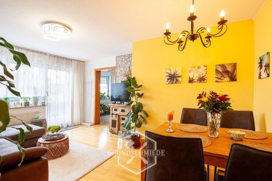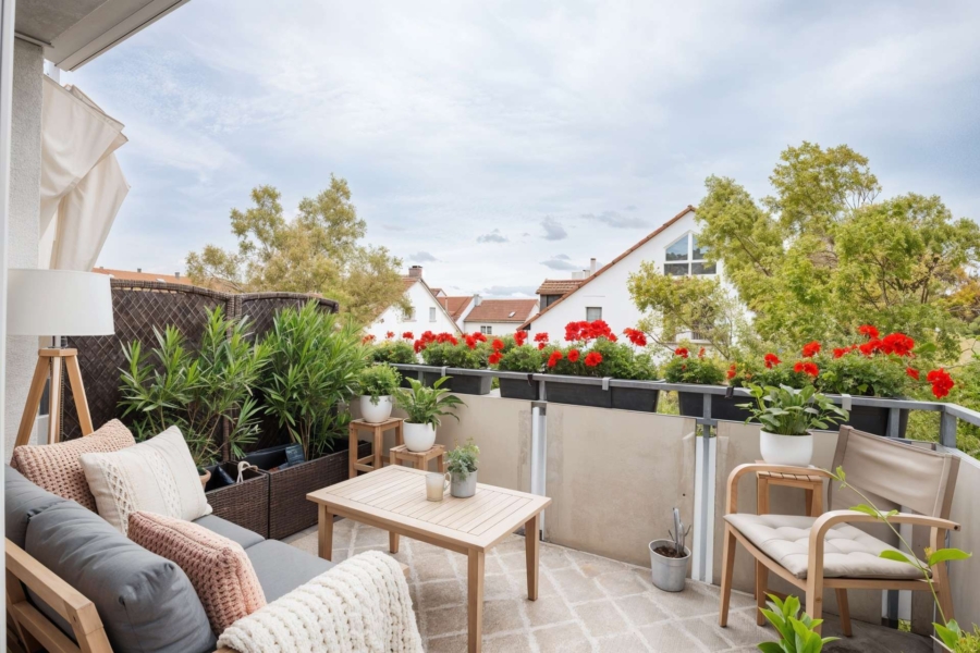 Das Herzstück der Wohnung ist der Wohn- und Essbereich, der durch seine Offenheit und Helligkeit beeindruckt. Großflächige Fensterfronten sorgen für viel Tageslicht und eine angenehme Wohnatmosphäre. Besonders hervorzuheben ist der großzügige Balkon, der direkt vom Wohnbereich aus zugänglich ist. Mit ausreichend Platz für eine gemütliche Sitzgruppe oder einen Esstisch bietet er ideale Voraussetzungen für entspannte Stunden im Freien oder gesellige Familienabende.