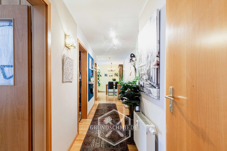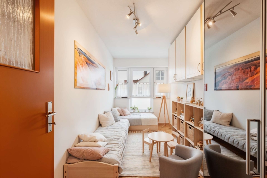Über den großzügigen Flur ist das gut geschnittene Kinderzimmer erreichbar. Auch hier sorgen große Fenster für eine freundliche und lichtdurchflutete Atmosphäre. Der Raum bietet ausreichend Platz für Bett, Schreibtisch und Stauraum – ideal für Kinder jeden Alters.