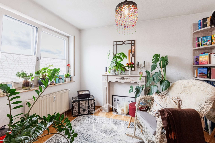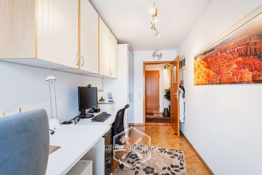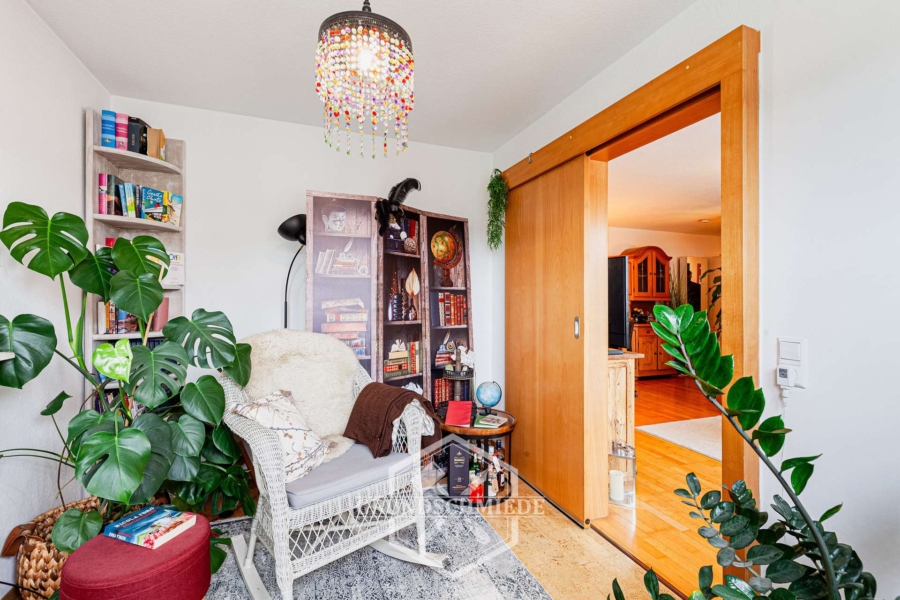 Angrenzend an den Wohnbereich befindet sich ein weiterer, etwas kleinerer Raum, der durch eine Schiebetür abgetrennt ist. Auch dieser Raum ist sehr hell und eignet sich hervorragend als Arbeitszimmer oder Gästezimmer. Die flexible Nutzungsmöglichkeit macht ihn zu einem echten Pluspunkt der Wohnung.