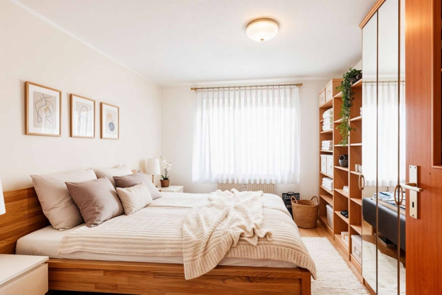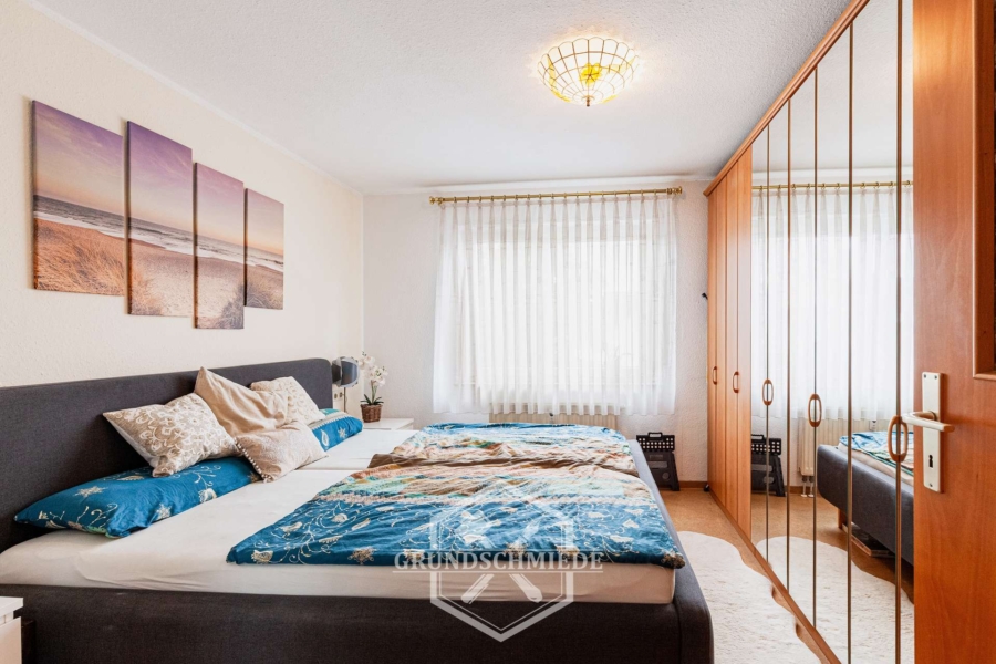 Das geräumige Schlafzimmer bietet viel Platz für ein großes Doppelbett sowie einen großen Kleiderschrank. Die ruhige Lage innerhalb der Wohnung sorgt für erholsamen Schlaf. Die gute Raumgröße macht individuelle Möblierung problemlos möglich.