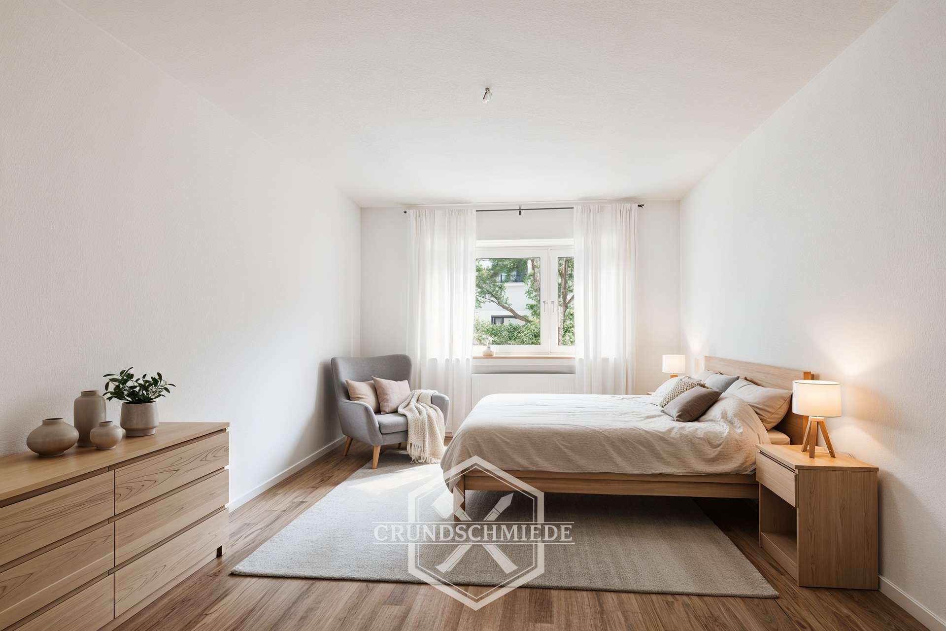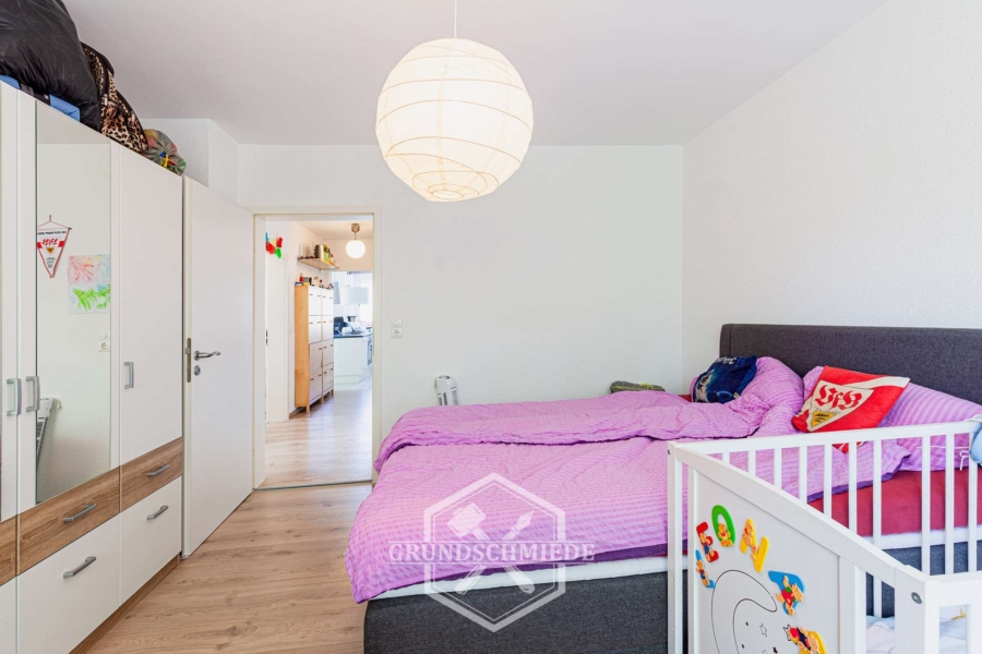 Das große Schlafzimmer überzeugt mit viel Platz und einer angenehmen Raumaufteilung. Hier lassen sich problemlos ein Doppelbett, Kleiderschrank und zusätzliche Möbelstücke unterbringen, sodass ein komfortabler Rückzugsort entsteht.