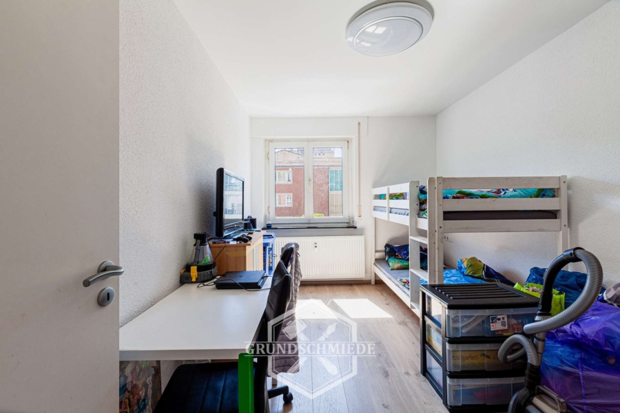 Das Kinderzimmer bietet ausreichend Fläche für Bett, Schreibtisch und Stauraum. Es eignet sich ebenso gut als Arbeits- oder Gästezimmer und passt sich so flexibel den individuellen Bedürfnissen an.