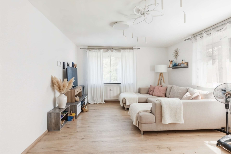 Das Wohnzimmer bildet das Herzstück der Wohnung und überzeugt mit seiner großzügigen Raumwirkung und dem hellen, freundlichen Ambiente. Große Fensterflächen lassen viel Tageslicht herein und schaffen eine einladende Atmosphäre – ideal zum Entspannen, Wohlfühlen oder für gesellige Abende.