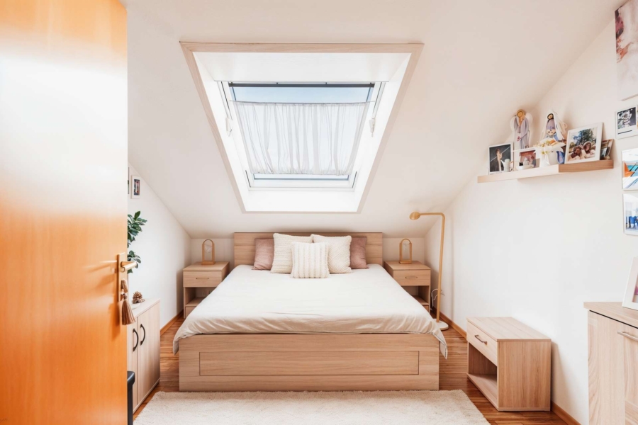 Das helle Schlafzimmer bietet genügend Platz für ein Doppelbett sowie einen Kleiderschrank. Ein weiteres Zimmer eignet sich ideal als Kinderzimmer oder Homeoffice.
