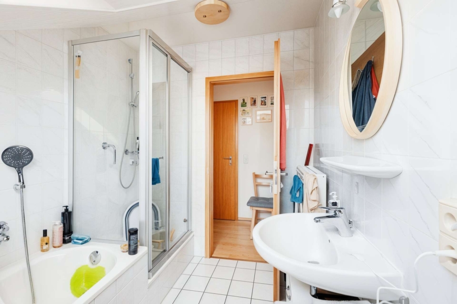 Das Tageslichtbad ist sowohl mit einer Dusche als auch mit einer Badewanne ausgestattet. Ein separates WC sorgt für zusätzlichen Komfort.