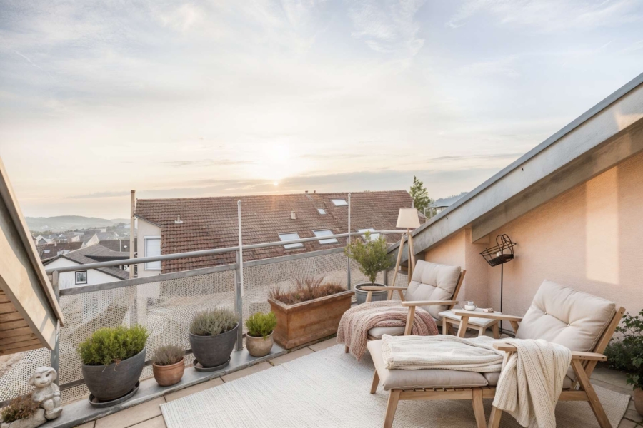 Die Wohnung verfügt über insgesamt drei Zimmer. Herzstück ist der offen gestaltete Wohn- und Essbereich mit direktem Zugang zum traumhaften Südbalkon. Dieser bietet ausreichend Platz für einen Tisch mit Stühlen und lädt zum Verweilen in der Sonne ein.