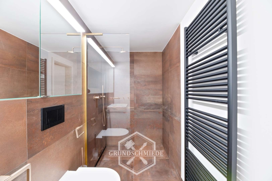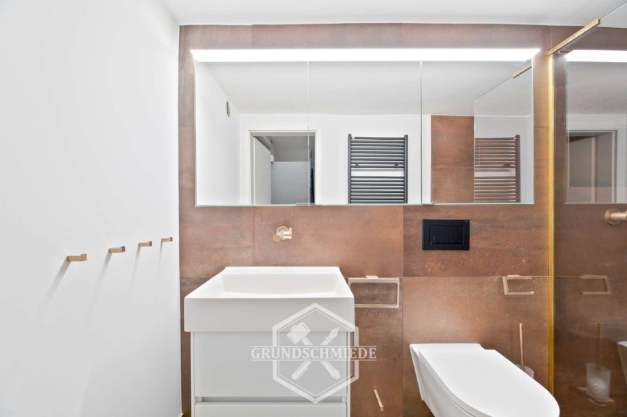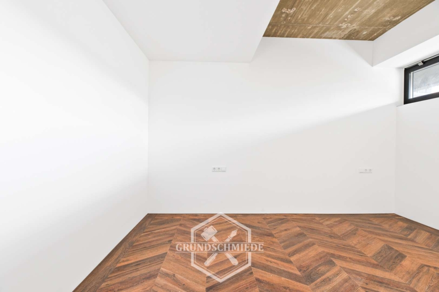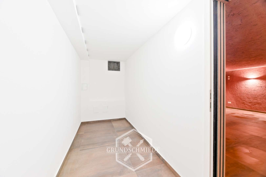 Das Untergeschoss dieser Wohnung bietet eine Vielzahl an Möglichkeiten. Hier befindet sich ein modernes Badezimmer mit WC, Dusche und Waschbecken sowie einem eingebauten Spiegelschrank. Angrenzend dazu gibt es einen besonders großzügig geschnittenen Raum, der mit Blick auf die Nutzung als Wellness- oder Fitnessbereich geplant und gebaut wurde. Dieser Raum verfügt über eine ausgezeichnete Belüftung, die für eine angenehme Atmosphäre sorgt und sich perfekt für private Wellnessanwendungen oder als Fitnessraum eignet. Ein Waschmaschinenanschluss ist ebenfalls vorhanden.