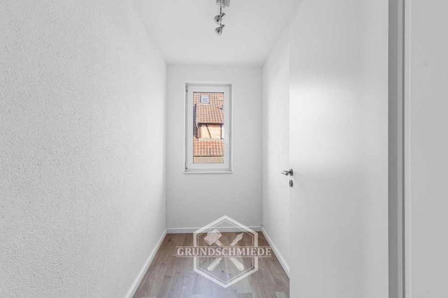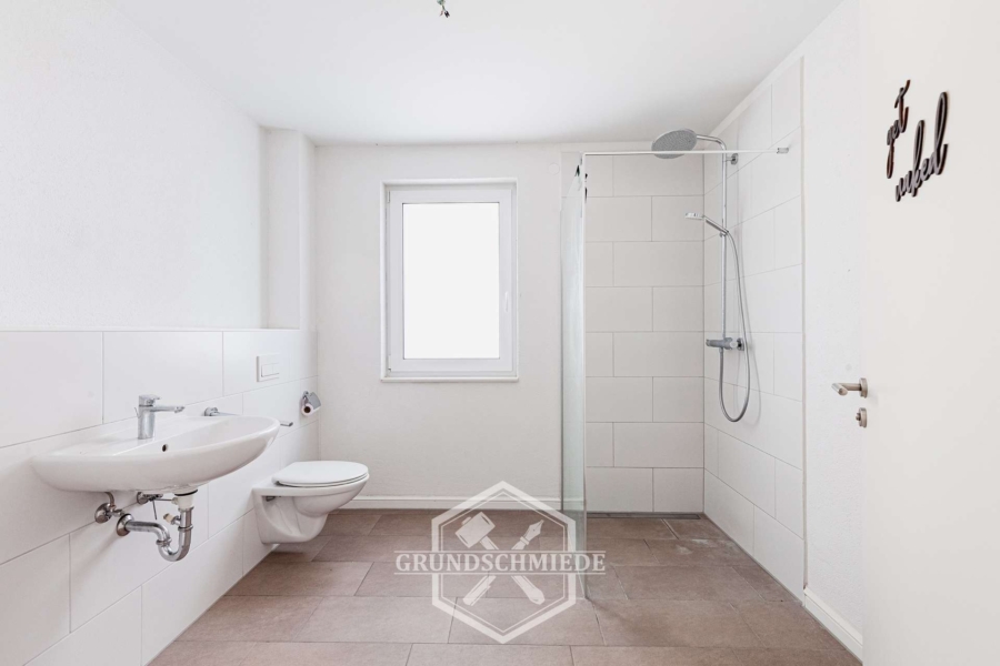 Das stilvolle Tageslichtbad überzeugt durch hochwertige Sanitärelemente und zeitgemäßes Design. Ein separater Abstellraum bietet zusätzlichen Stauraum und Komfort.