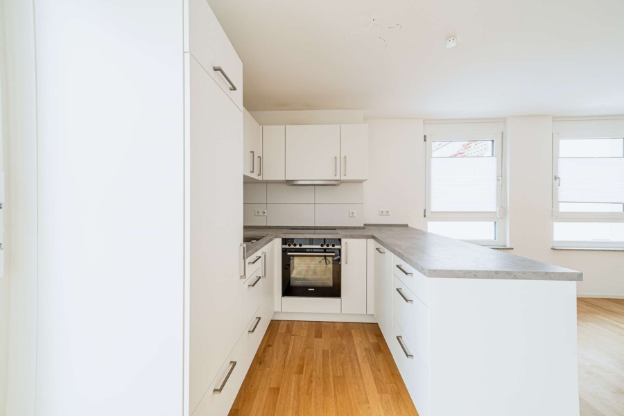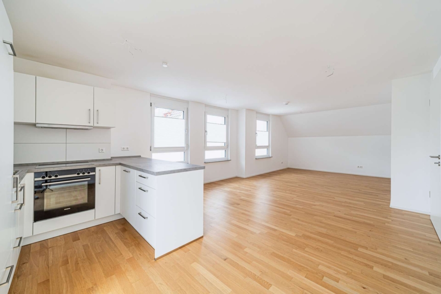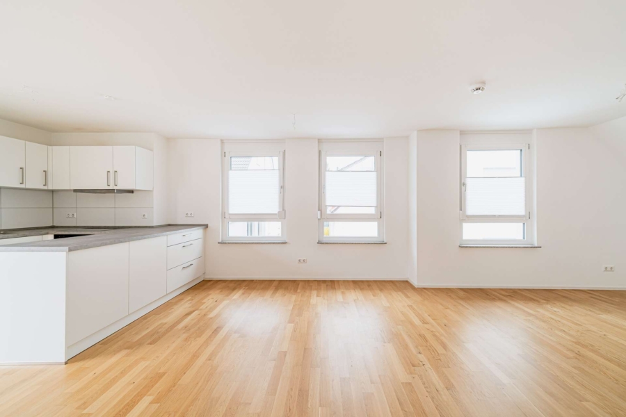 Das Herzstück der Wohnung bildet der lichtdurchflutete Wohn- und Essbereich mit offener Einbauküche. Von hier aus gelangen Sie direkt auf die Terrasse, die zusätzlichen Raum zur Erholung im Freien bietet. Die offene Gestaltung sorgt für ein angenehmes Wohngefühl und verbindet Kochen, Essen und Wohnen auf harmonische Weise.