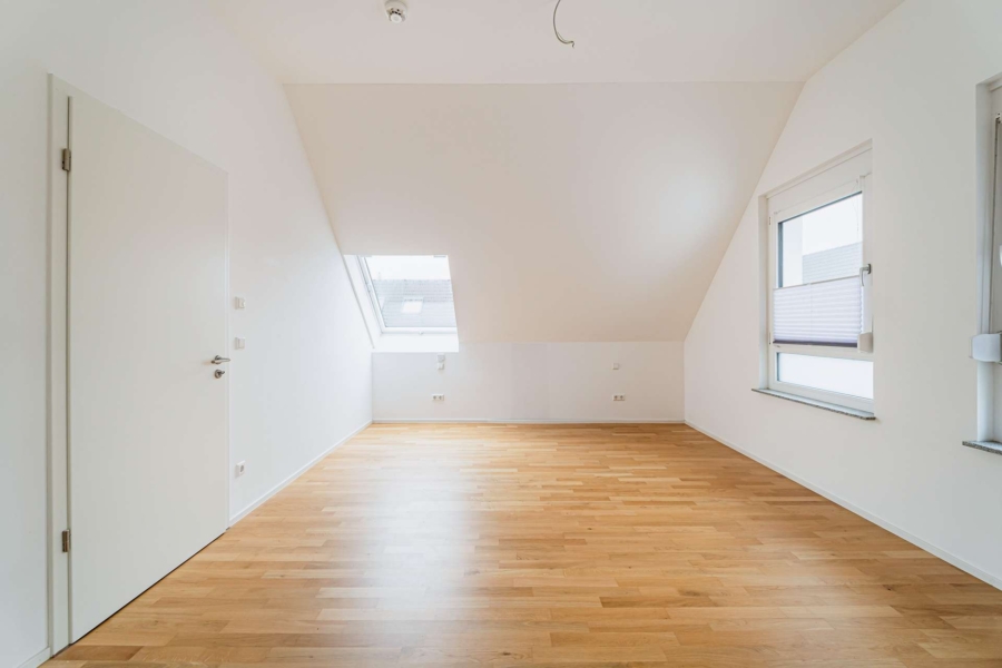 Insgesamt verfügt die Wohnung über drei Zimmer: Neben dem großzügigen Wohnbereich stehen ein Kinderzimmer im unteren Geschoss sowie ein geräumiges Schlafzimmer im oberen Bereich zur Verfügung, das ausreichend Platz für individuelle Gestaltungsmöglichkeiten bietet.
